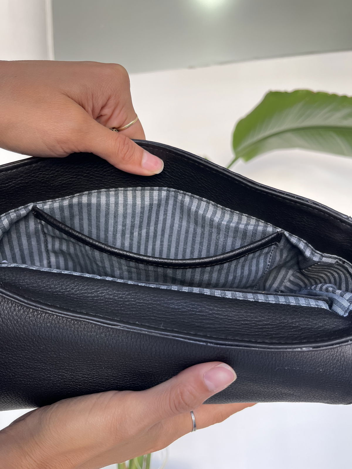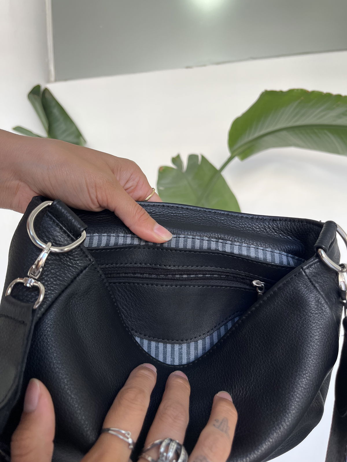 1 bolsillo interno con cierre, y otro bolsillo sin cierre.