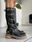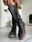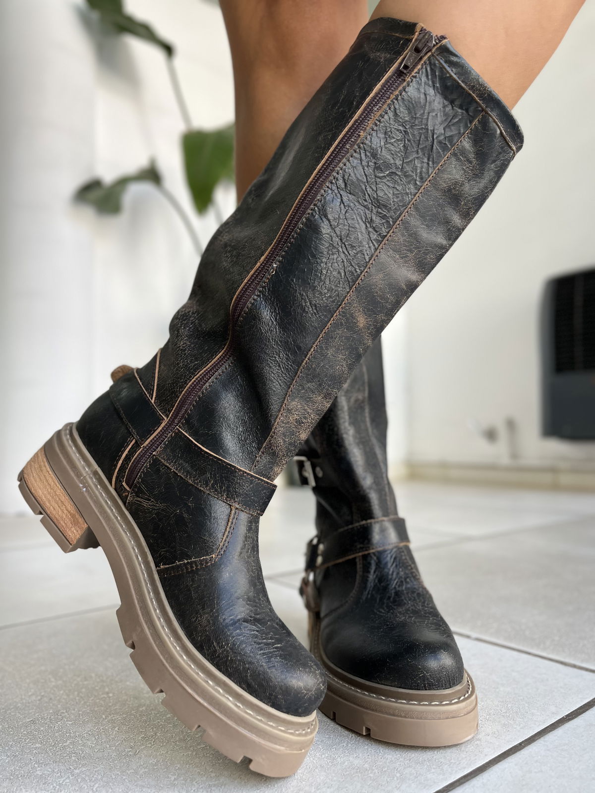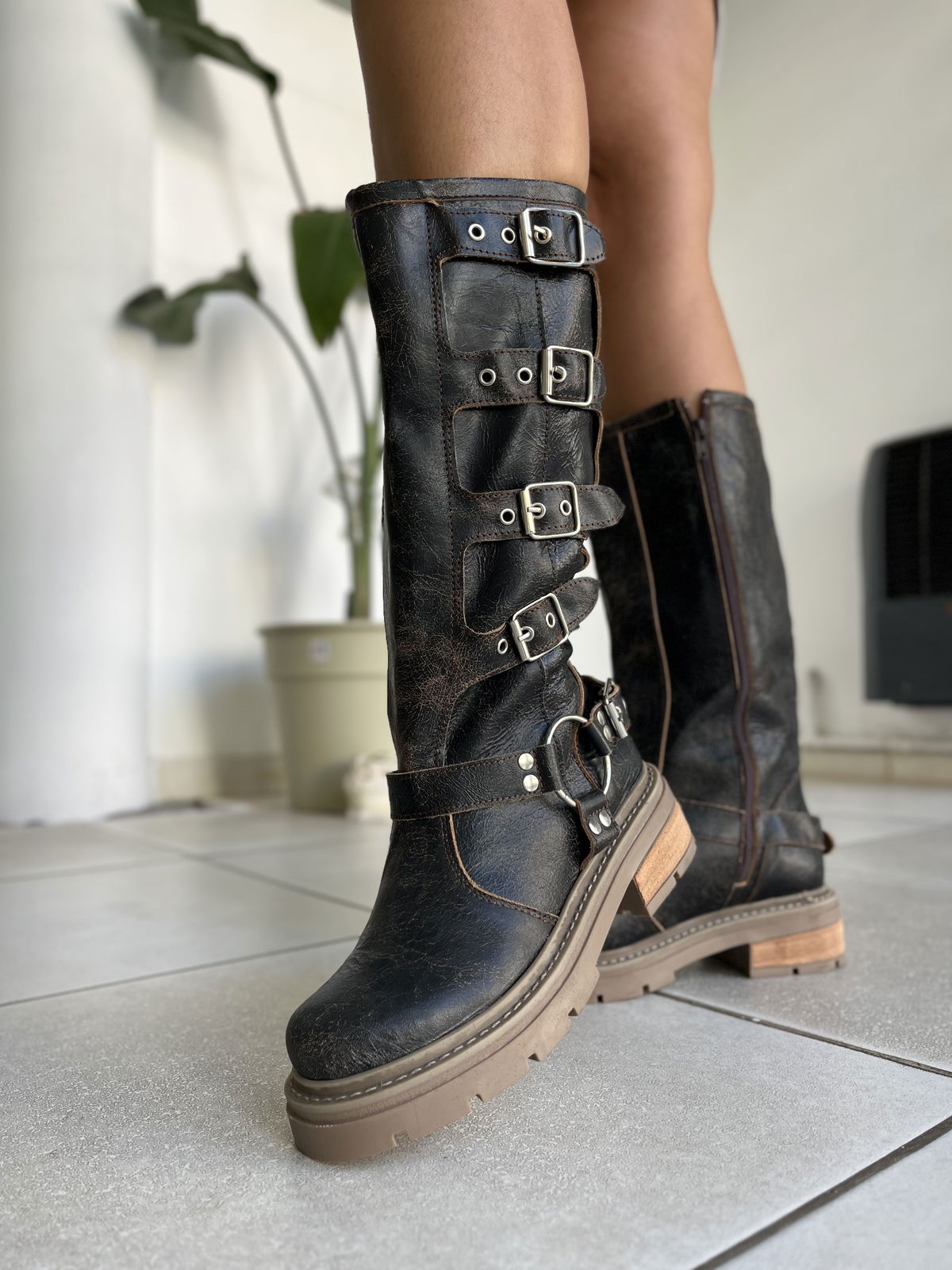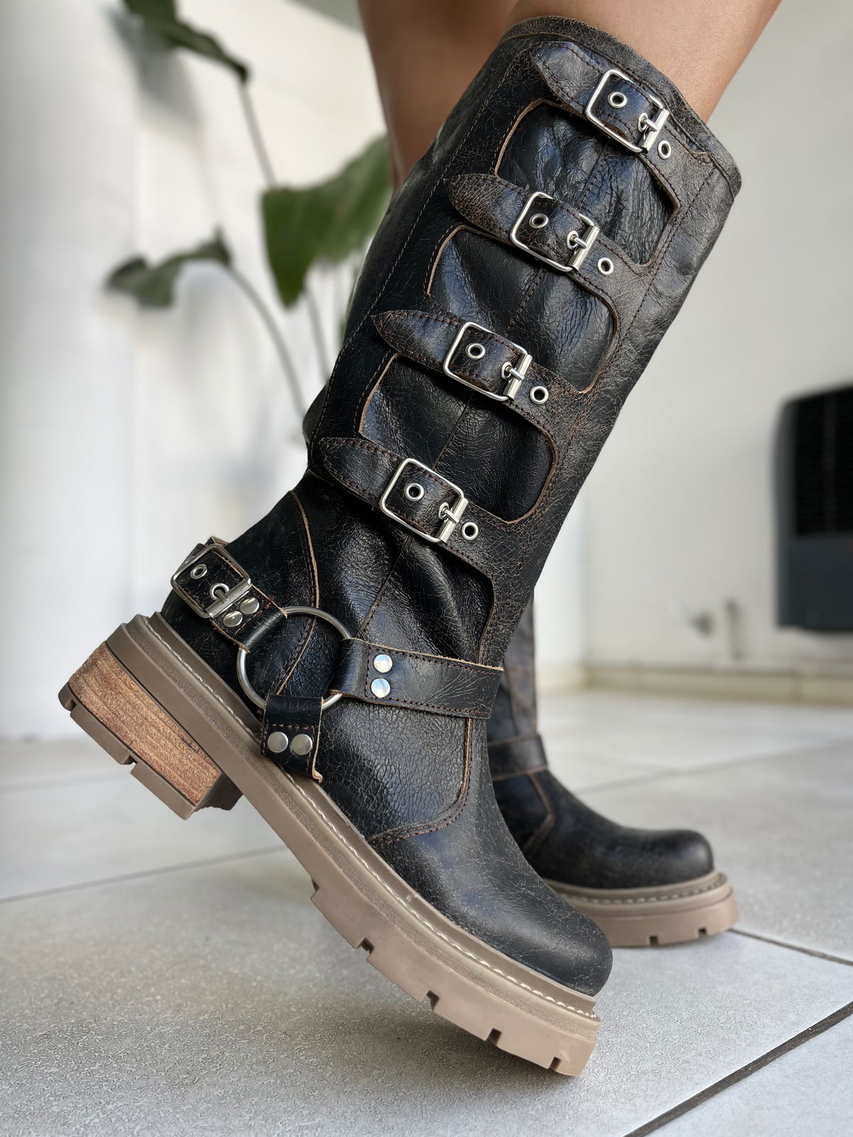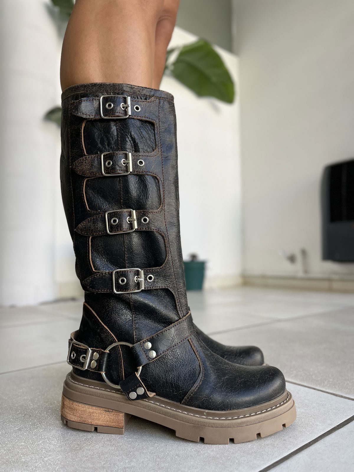 Bota de cuero vacuno con detalle de herrajes en acero inoxidable. Base de goma, liviana, flexible y antideslizante. Altura de caña: 33 cm. Taco de 4,5 cm. 36 - 23,5 cm 37 - 24cm 38 - 25cm 39 - 25,5cm 40 - 26cm