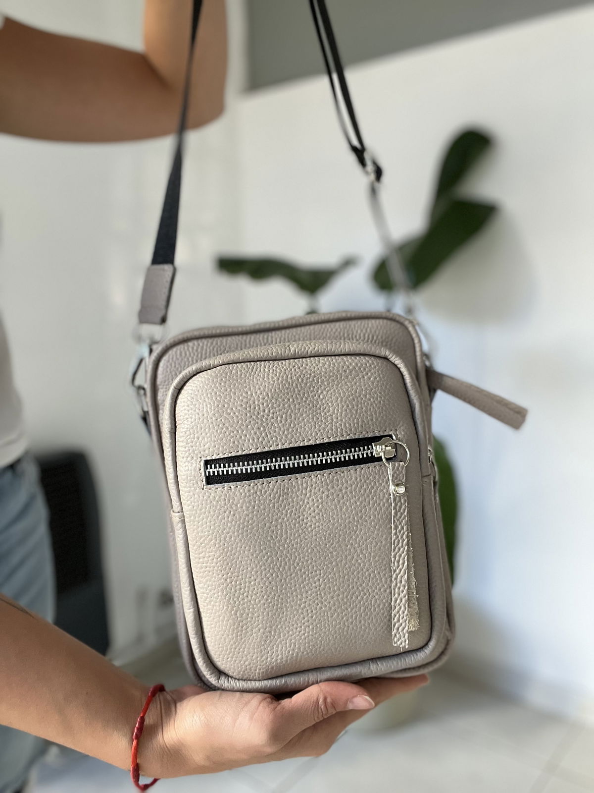 Bandolera de cuero vacuno, herrajes de acero inoxidable, tira regulable.