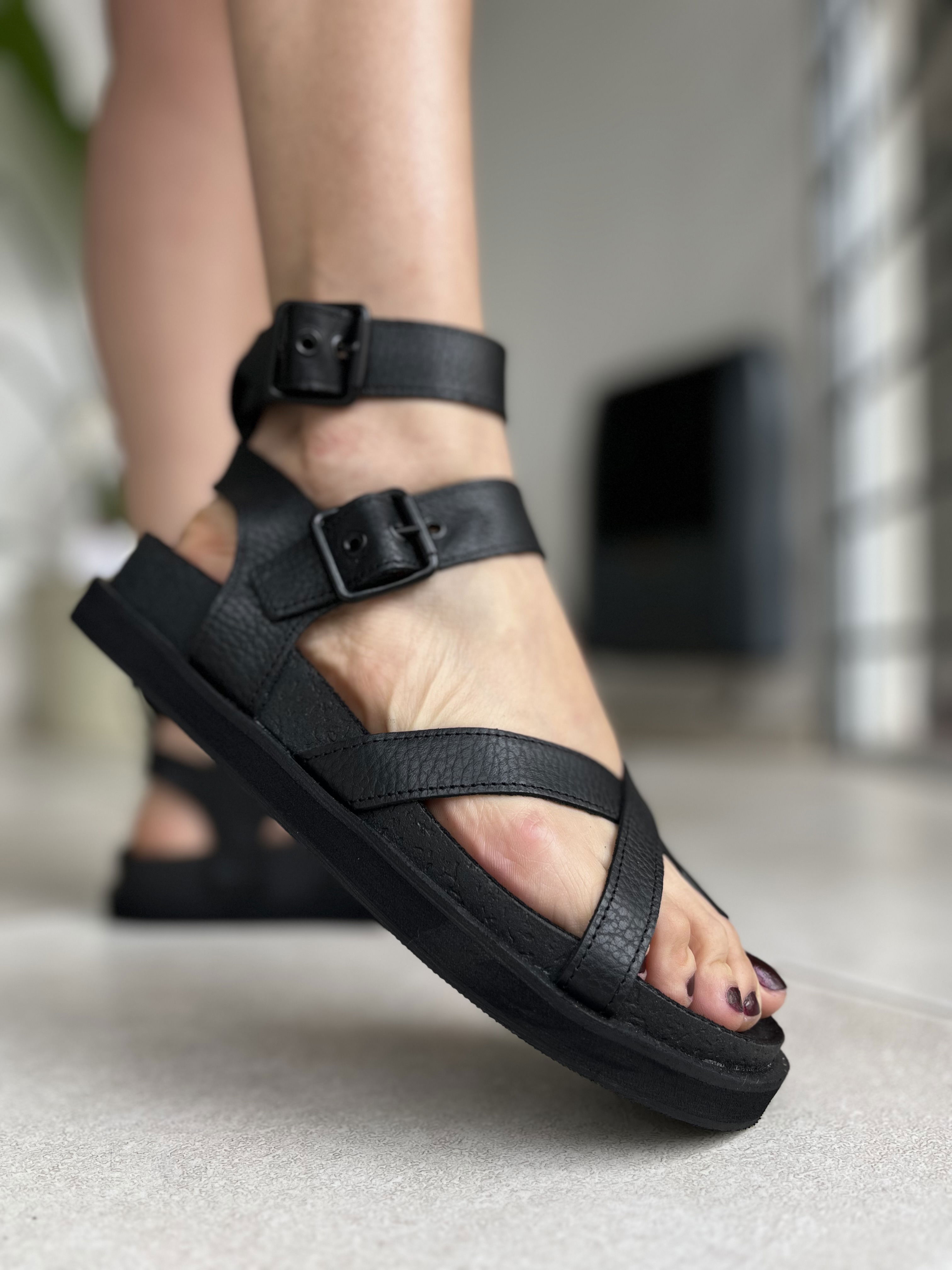 Sandalias de cuero vacuno, herrajes de acero inoxidable.