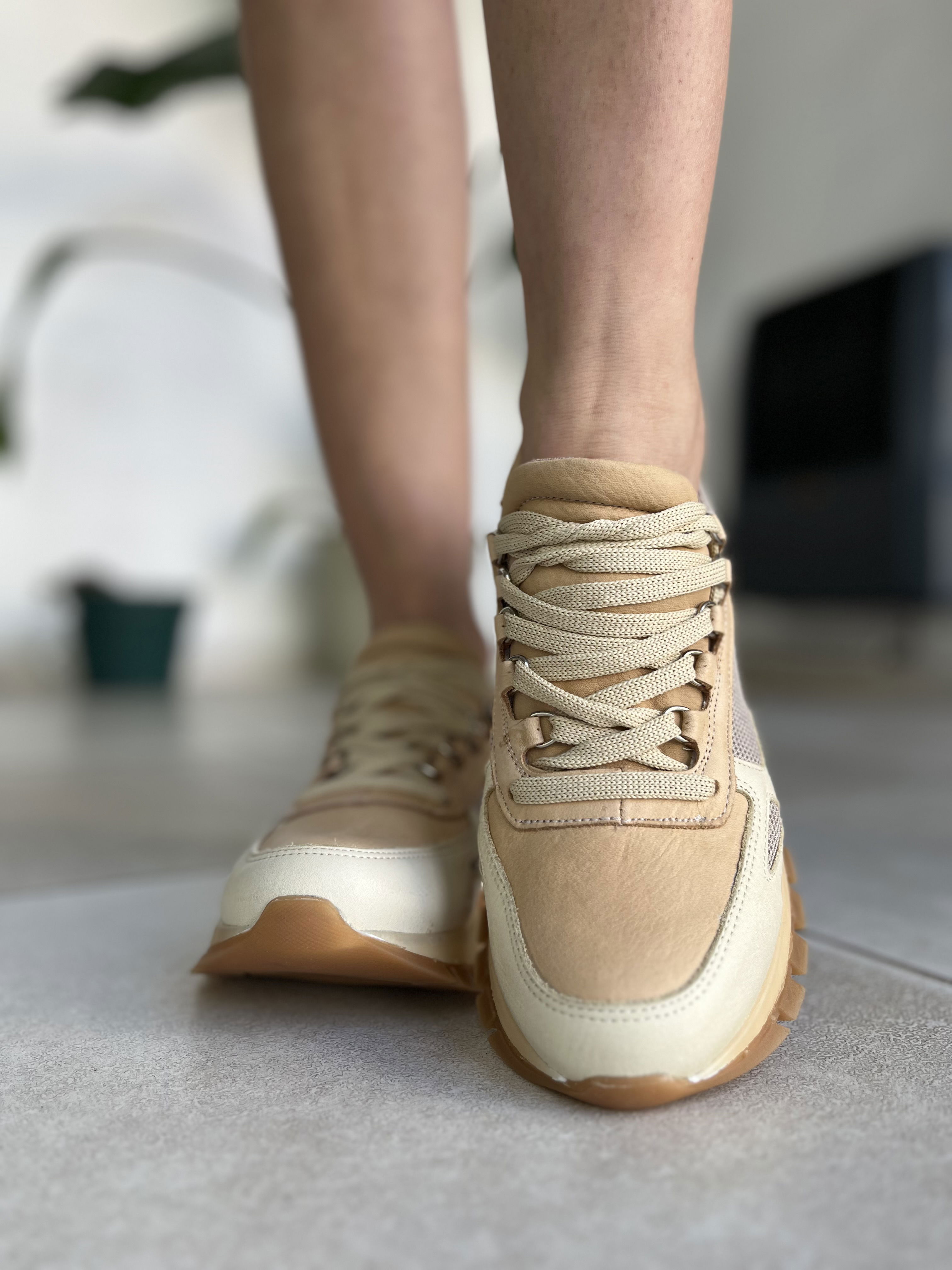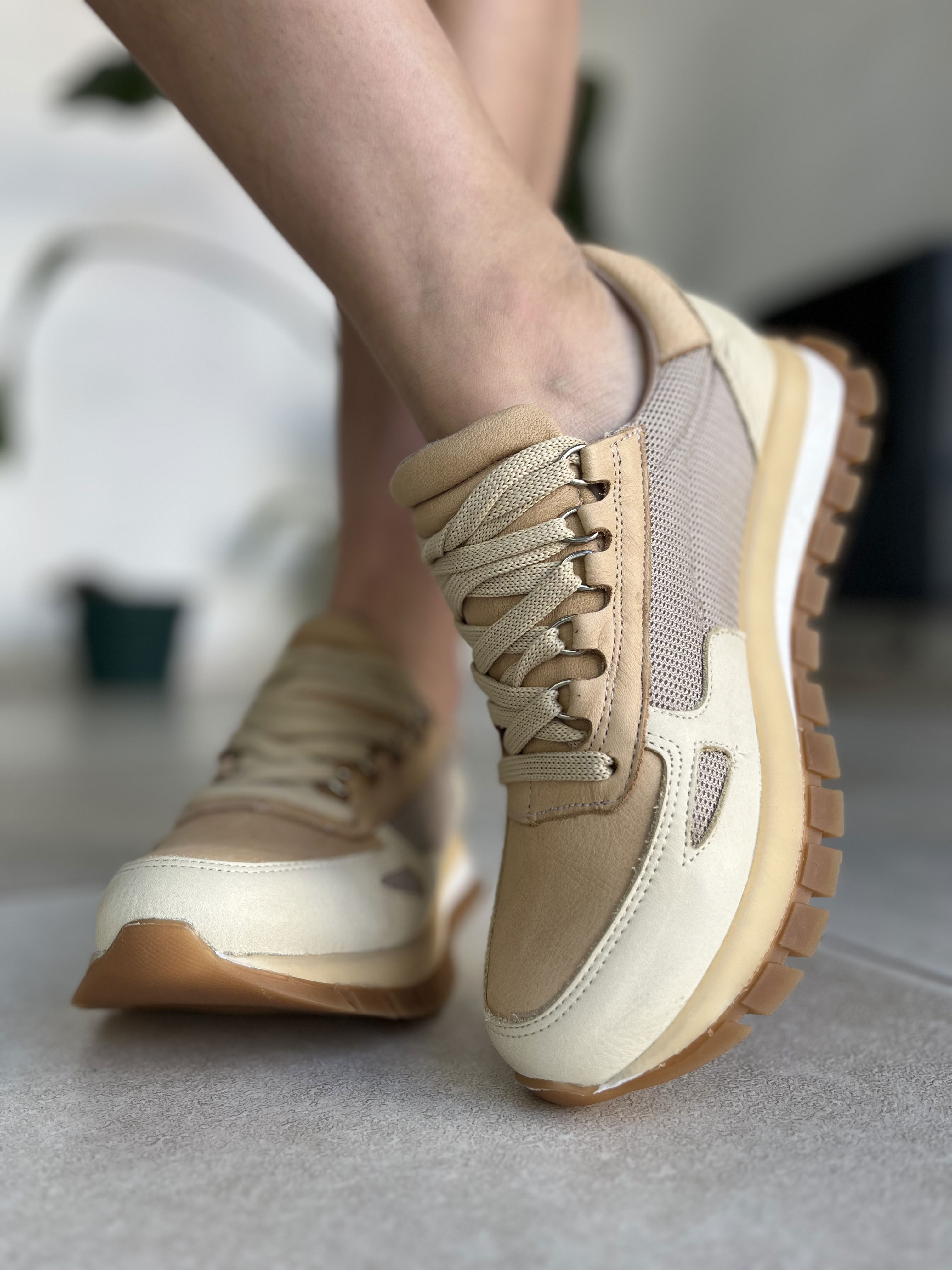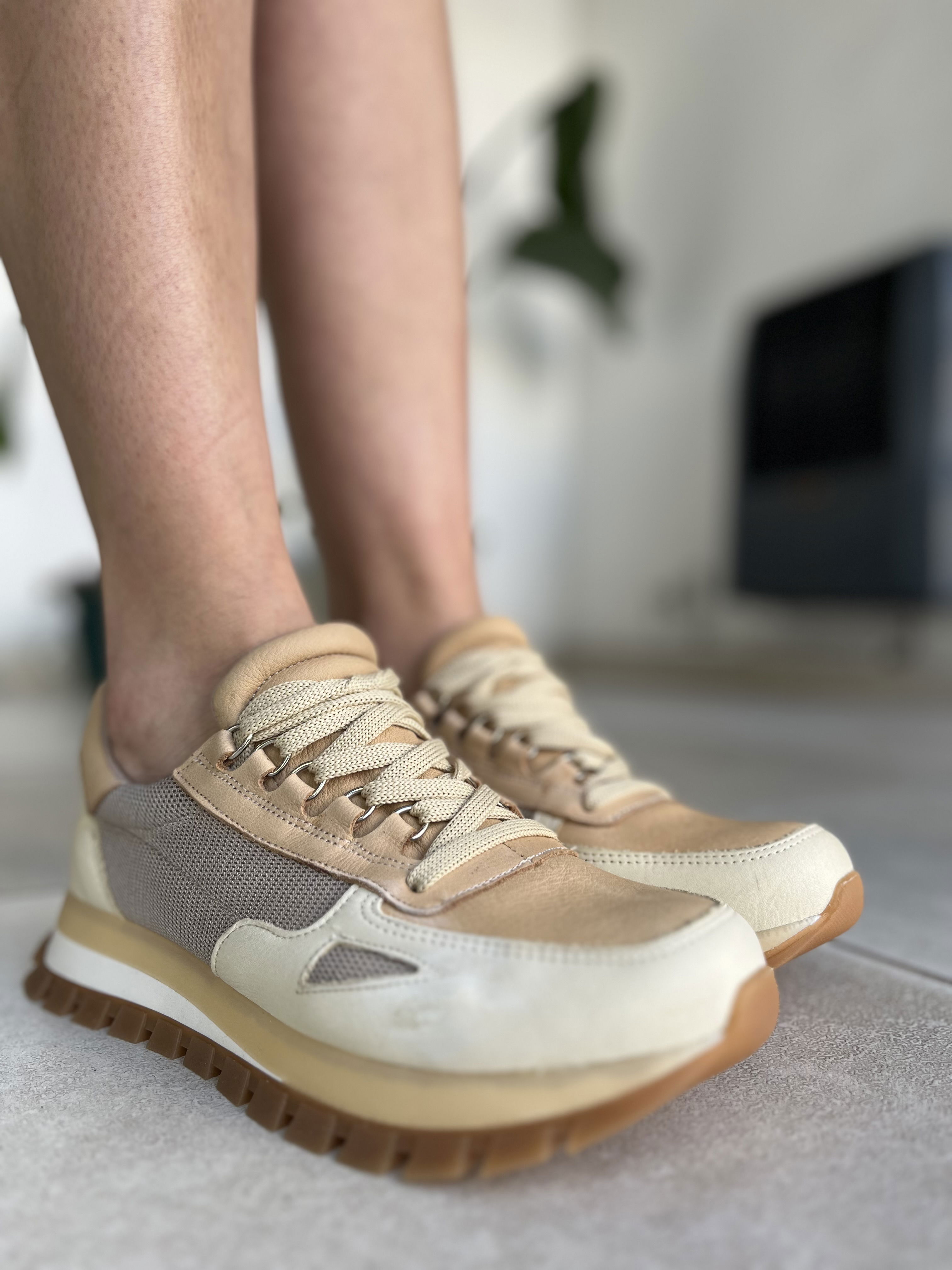 Zapatillas de cuero vacuno, combinadas con tela. Base de goma liviana, flexible y antideslizante.