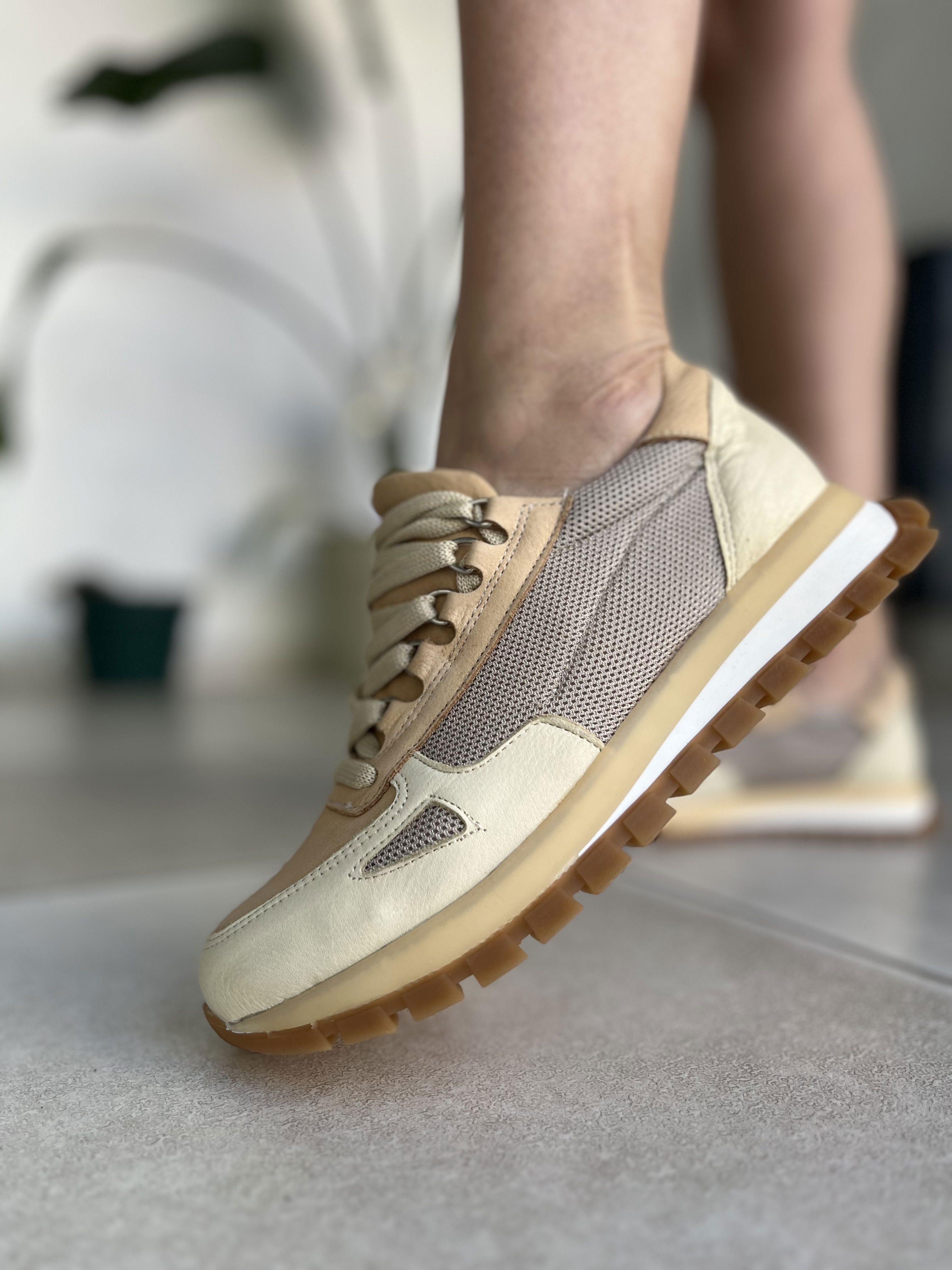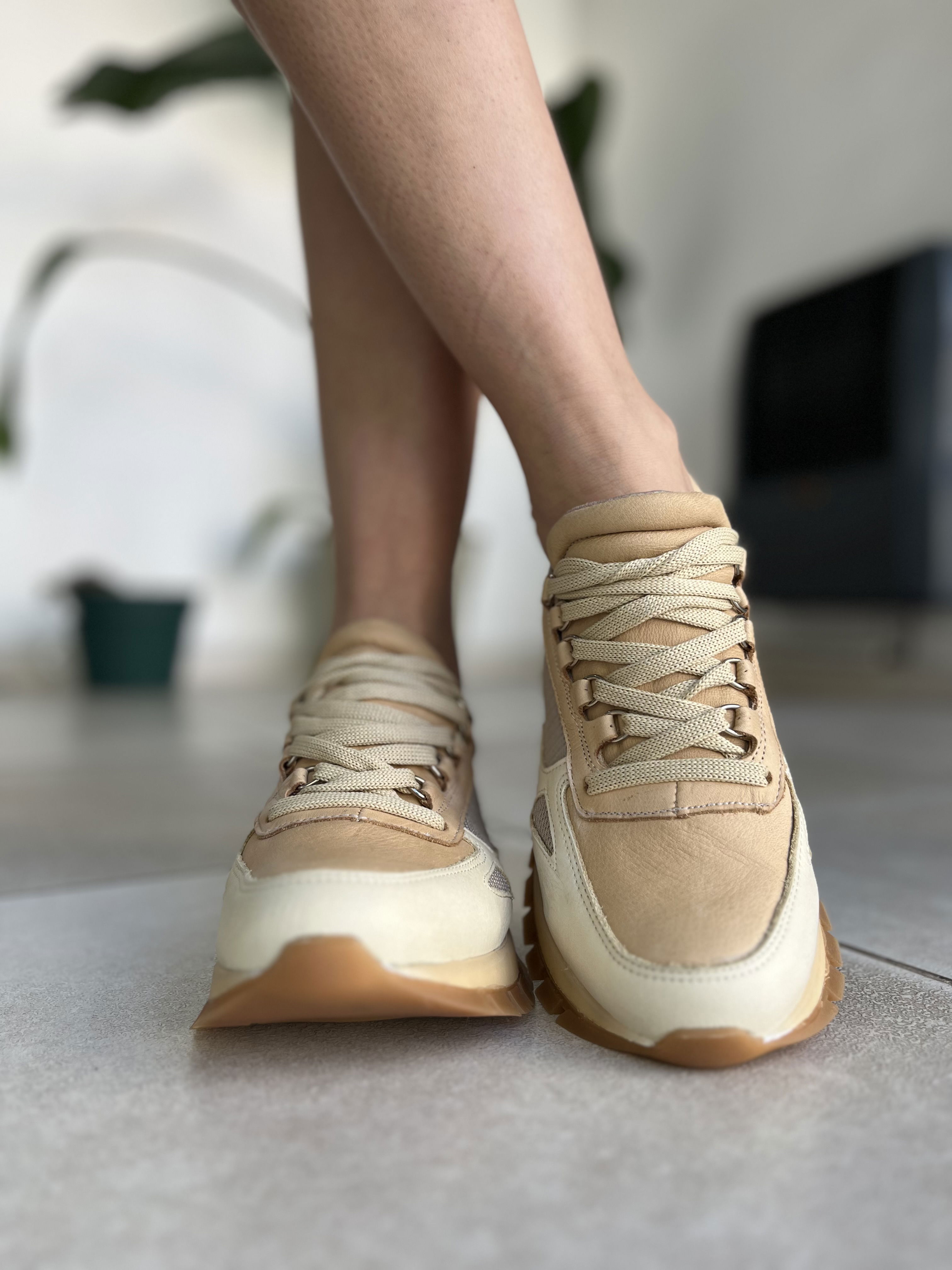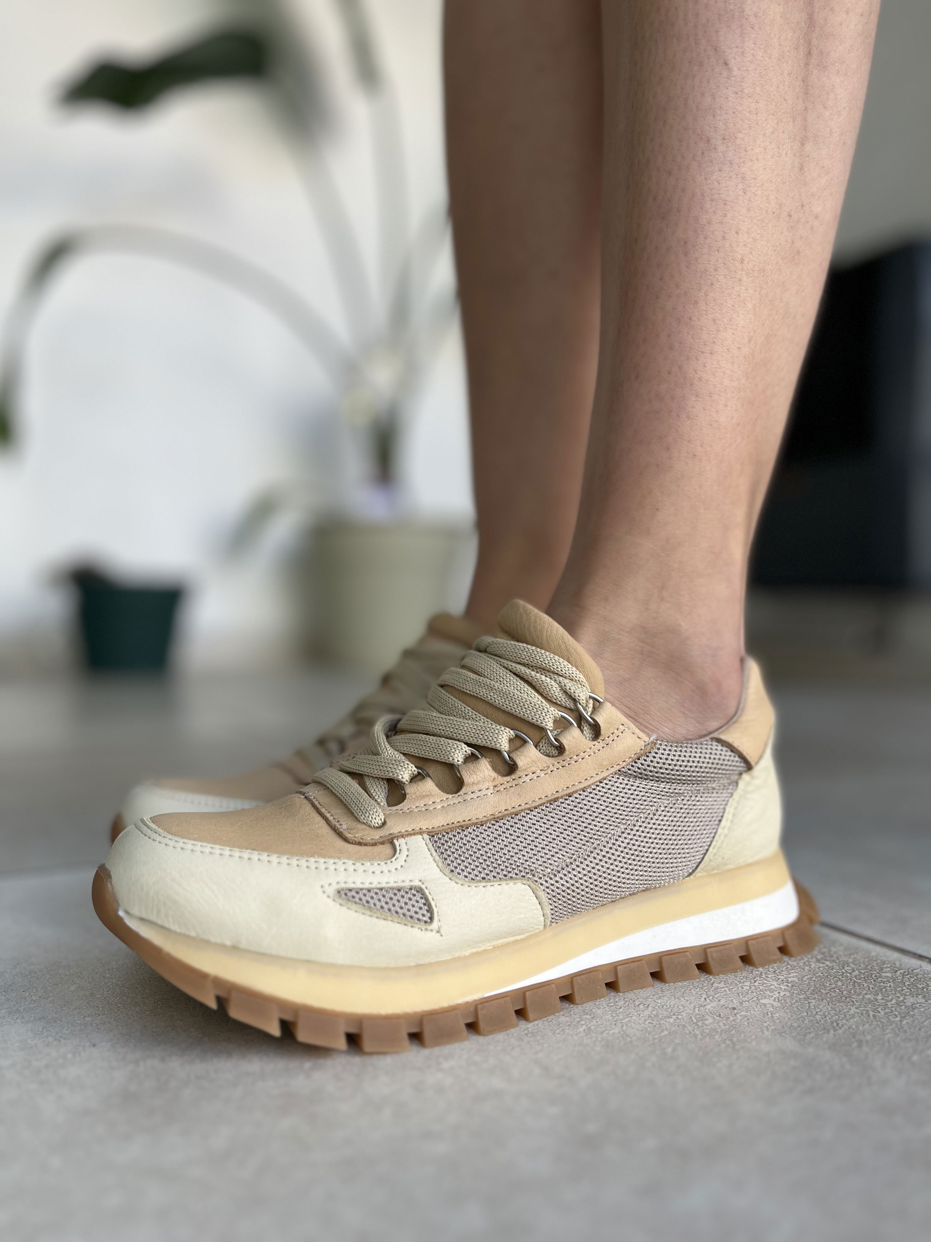 Zapatillas de cuero vacuno, combinadas con tela. Base de goma liviana, flexible y antideslizante.