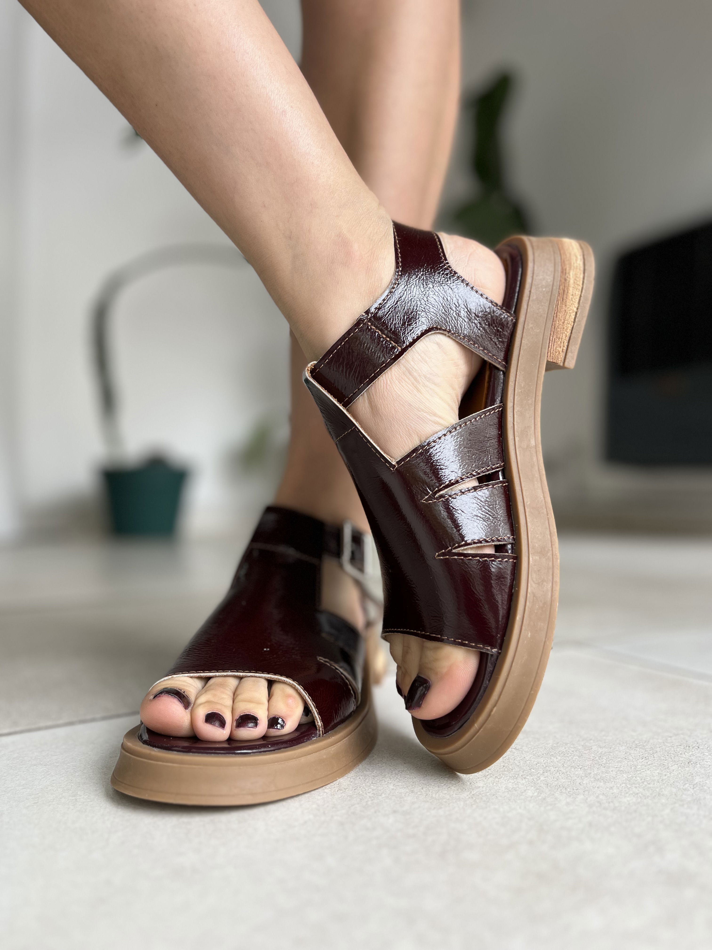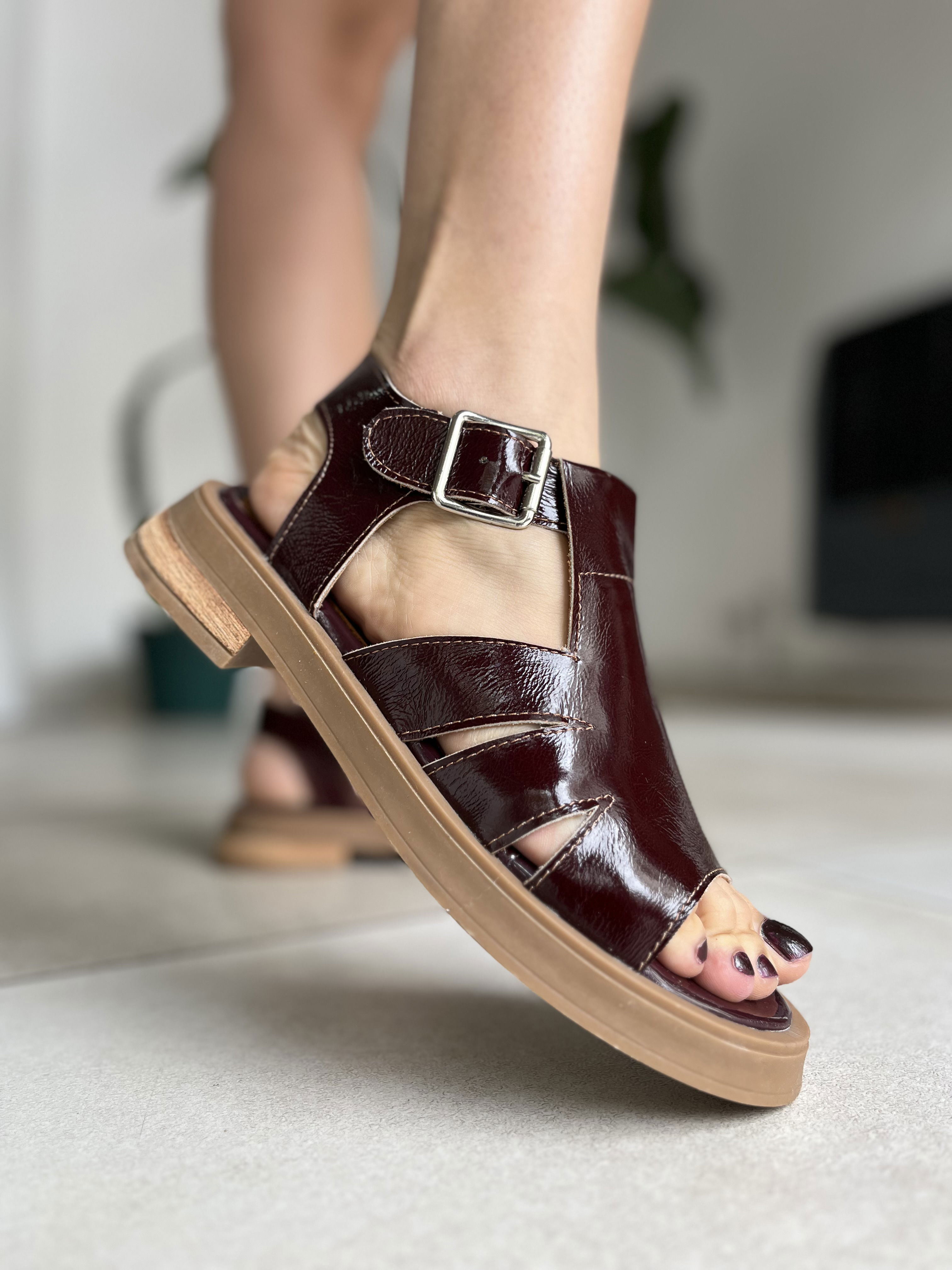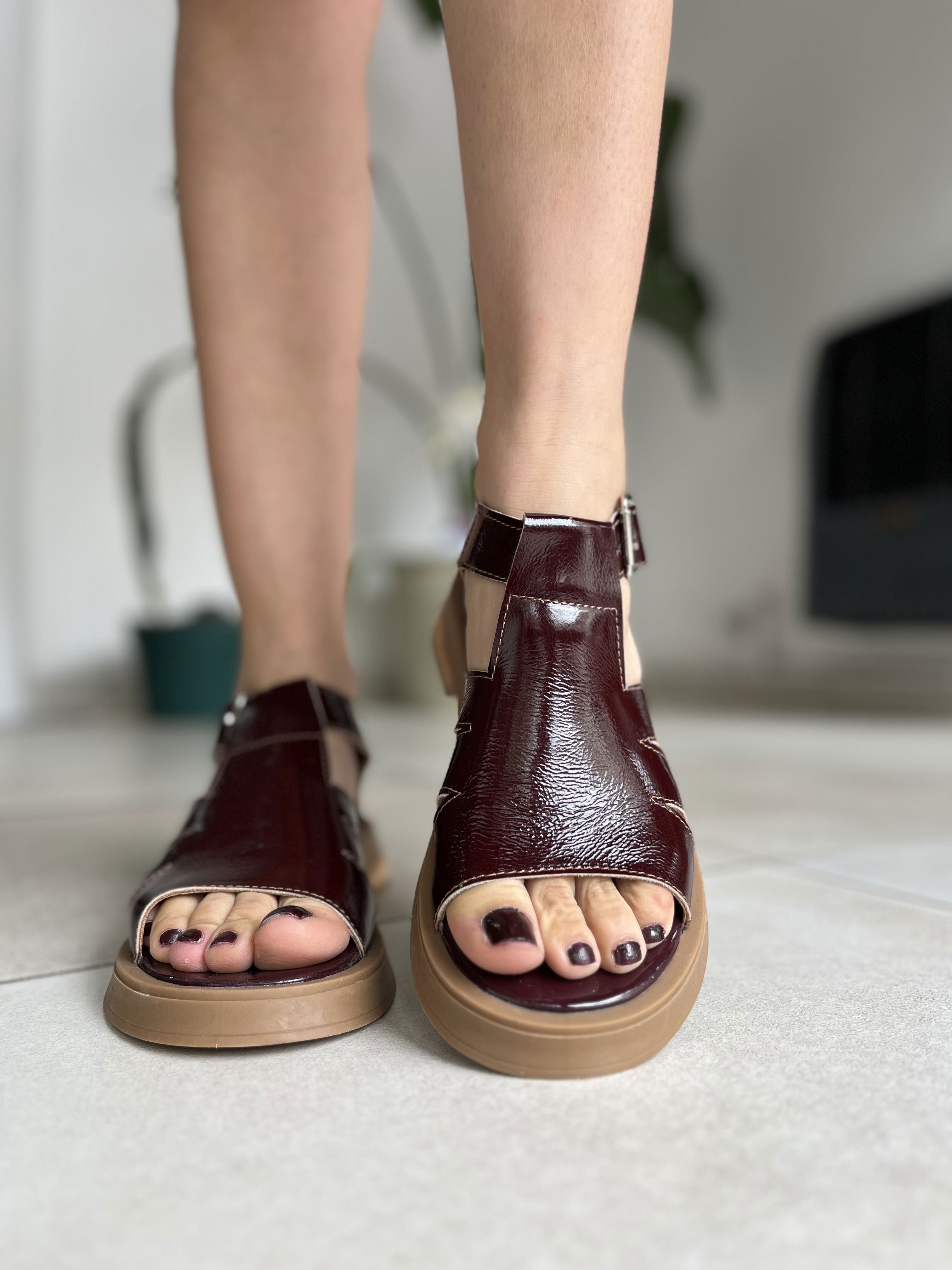 Sandalias de cuero vacuno, los herrajes son de acero inoxidable.