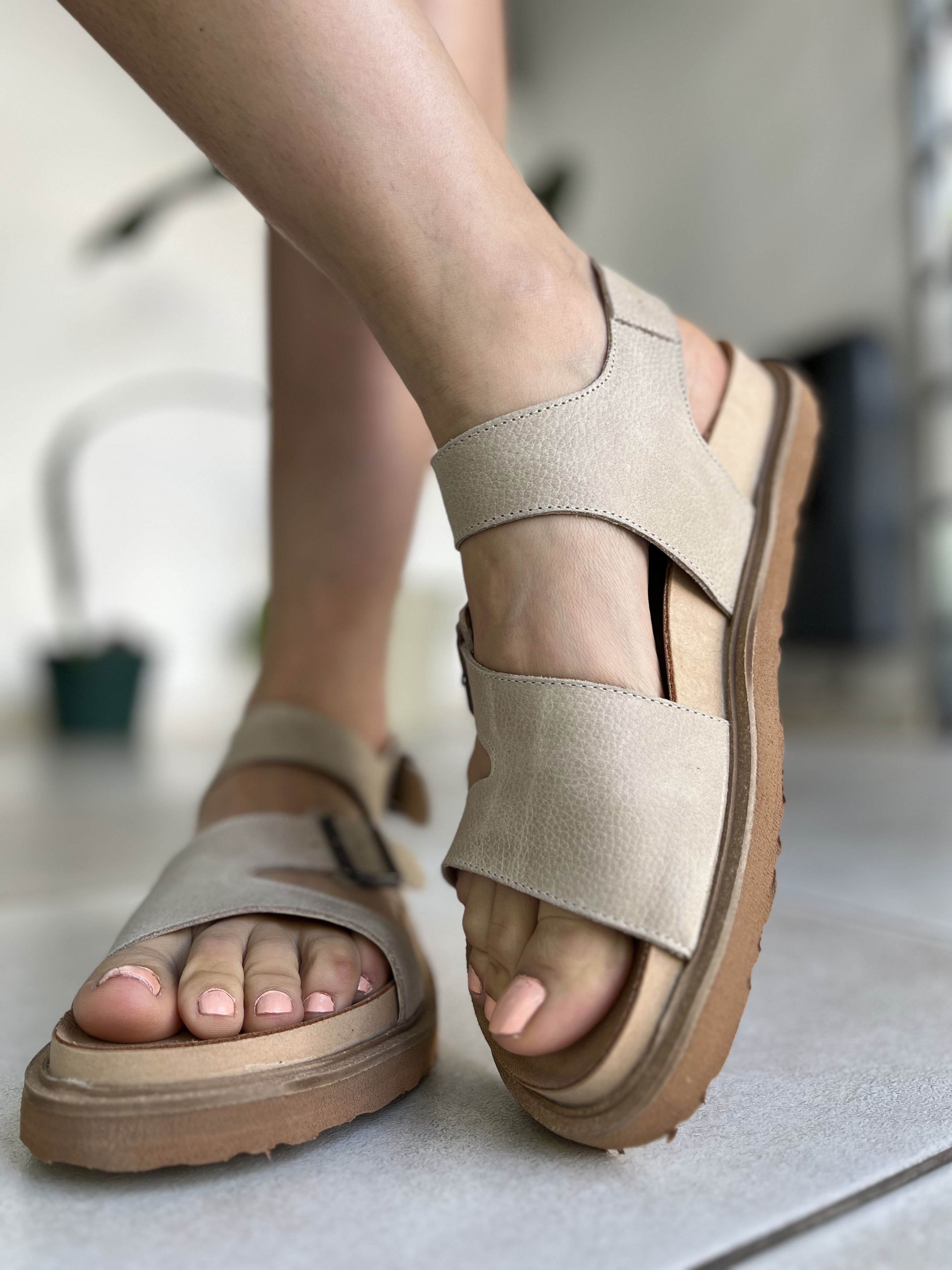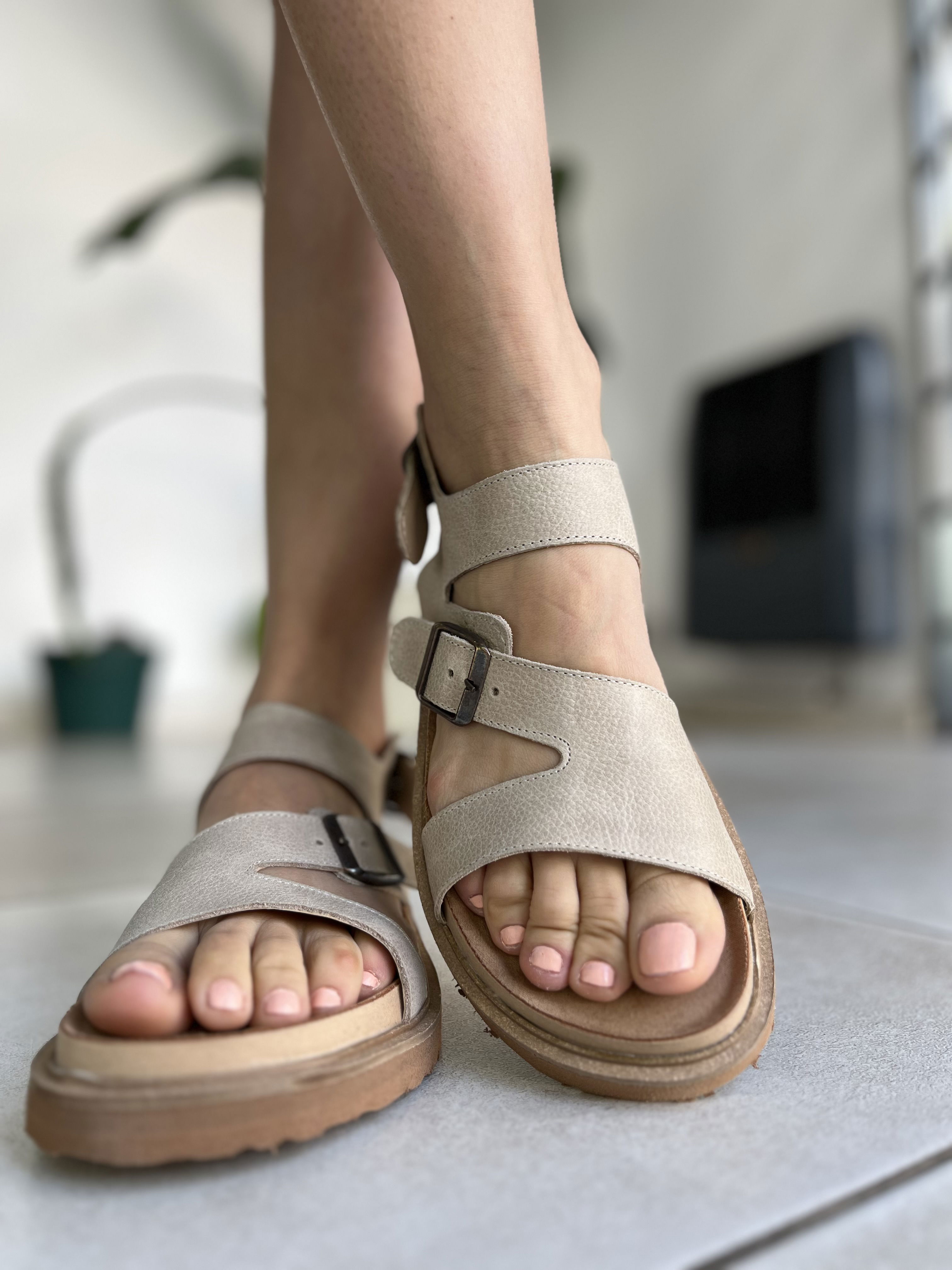 Sandalias de cuero vacuno Se regulan en empeine y talón. La base es de goma liviana, flexible y antideslizante. TABLA DE TALLES: 36 23.5 cm 37 24.5 cm 38 25.0 cm 39 25.7 cm 40 26.2 cm