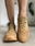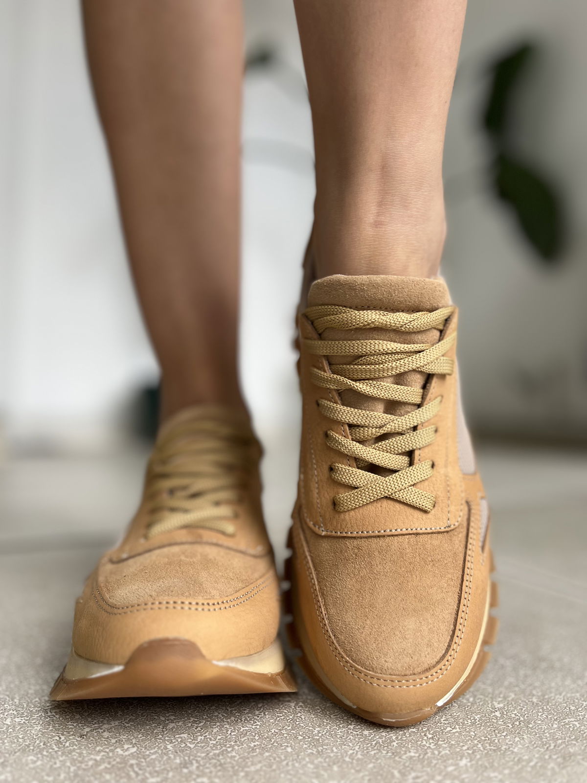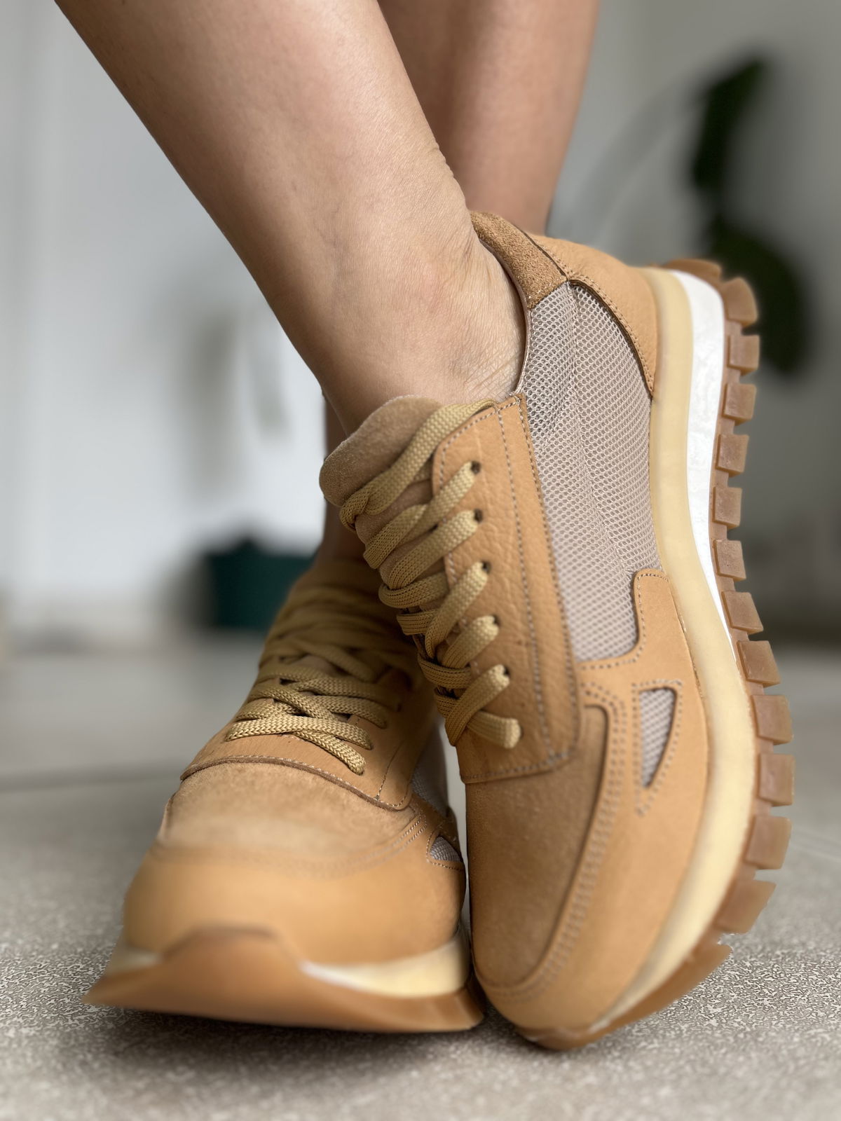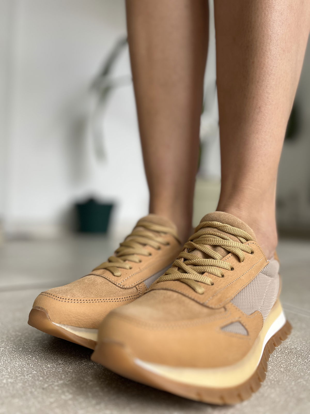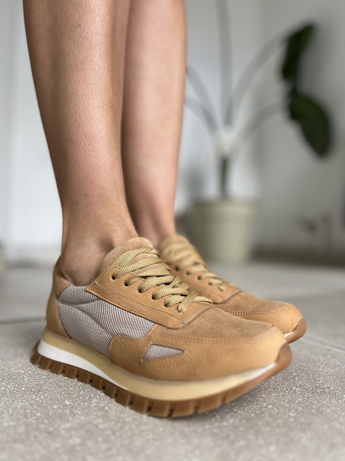 Zapatillas de cuero vacuno, combinadas con tela. Base de goma liviana, flexible y antideslizante.