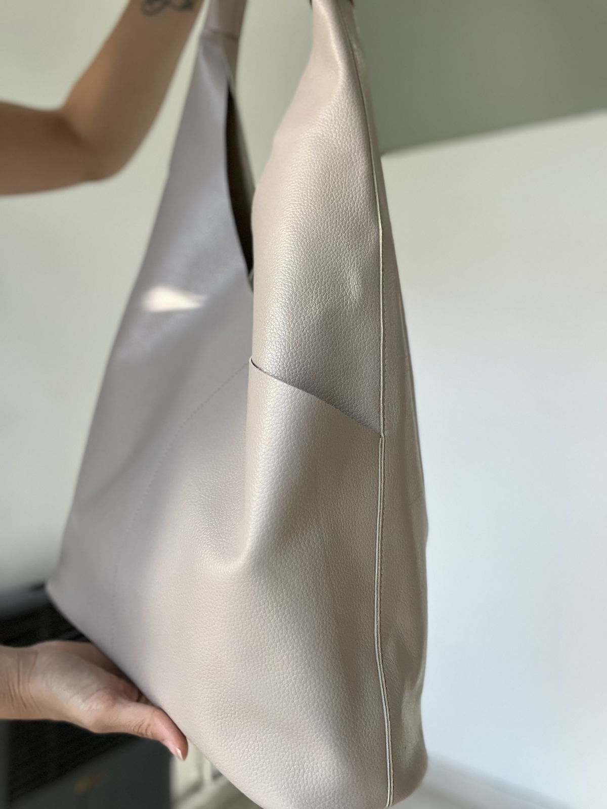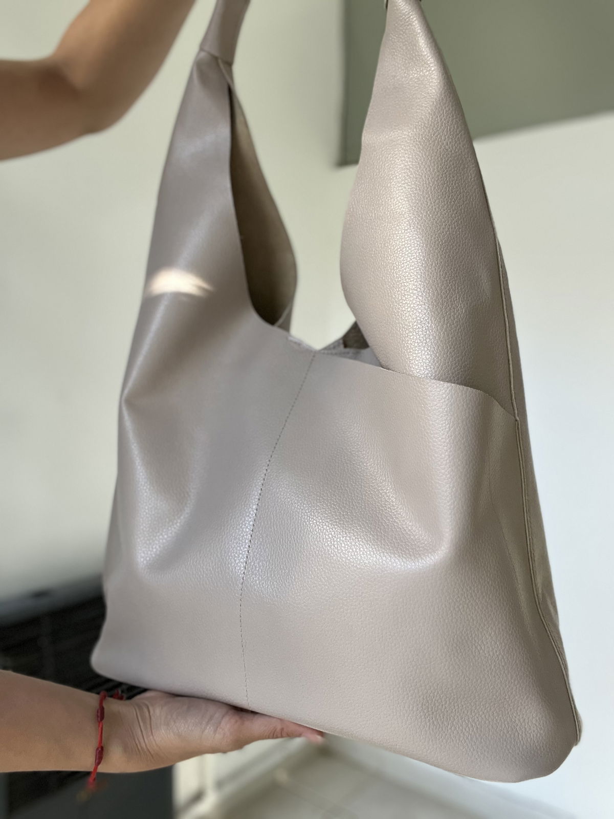 Cartera de cuero vacuno, la manija posee doble refuerzo.