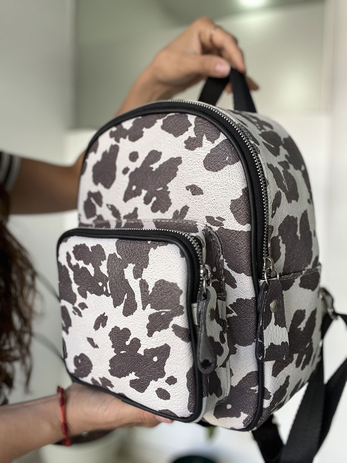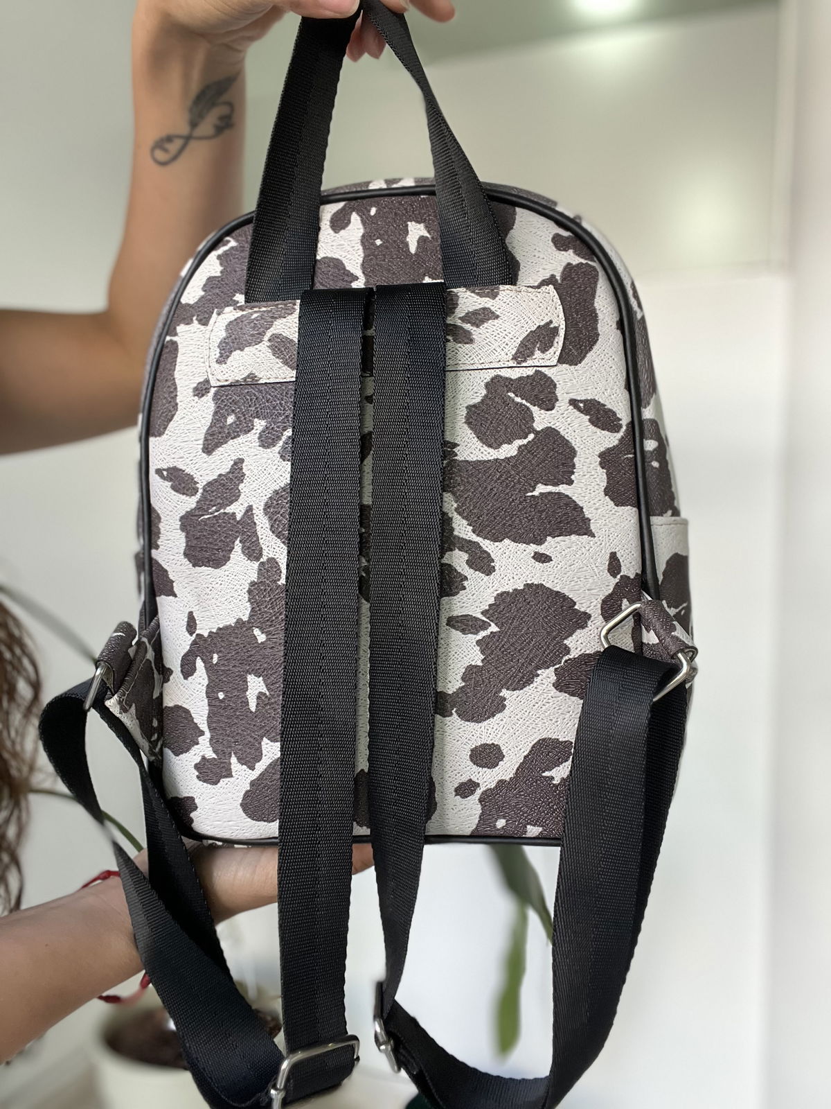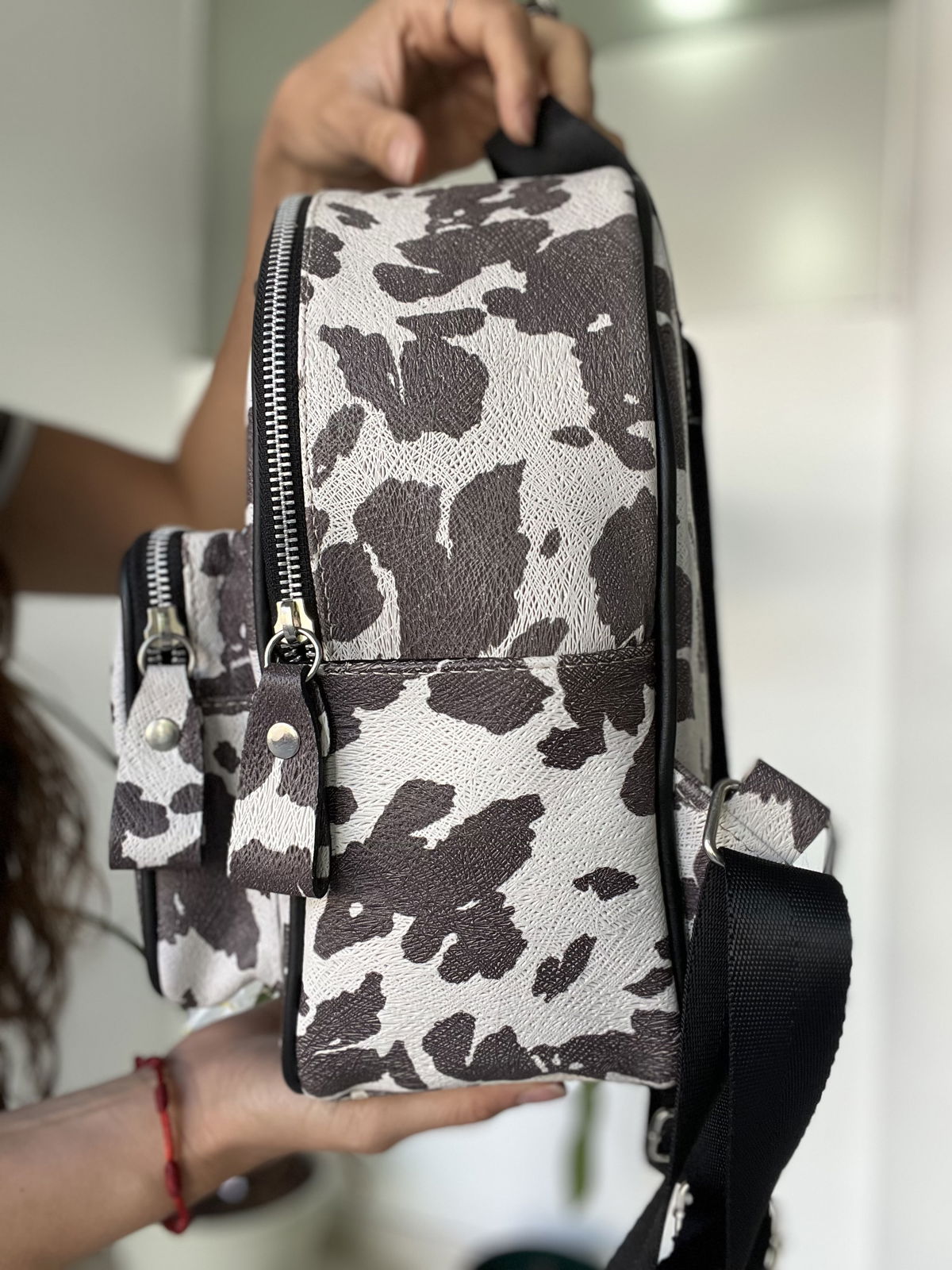 Mochila de cuero vacuno con bolsillo delantero, herrajes de acero inoxidable, tiras regulables.