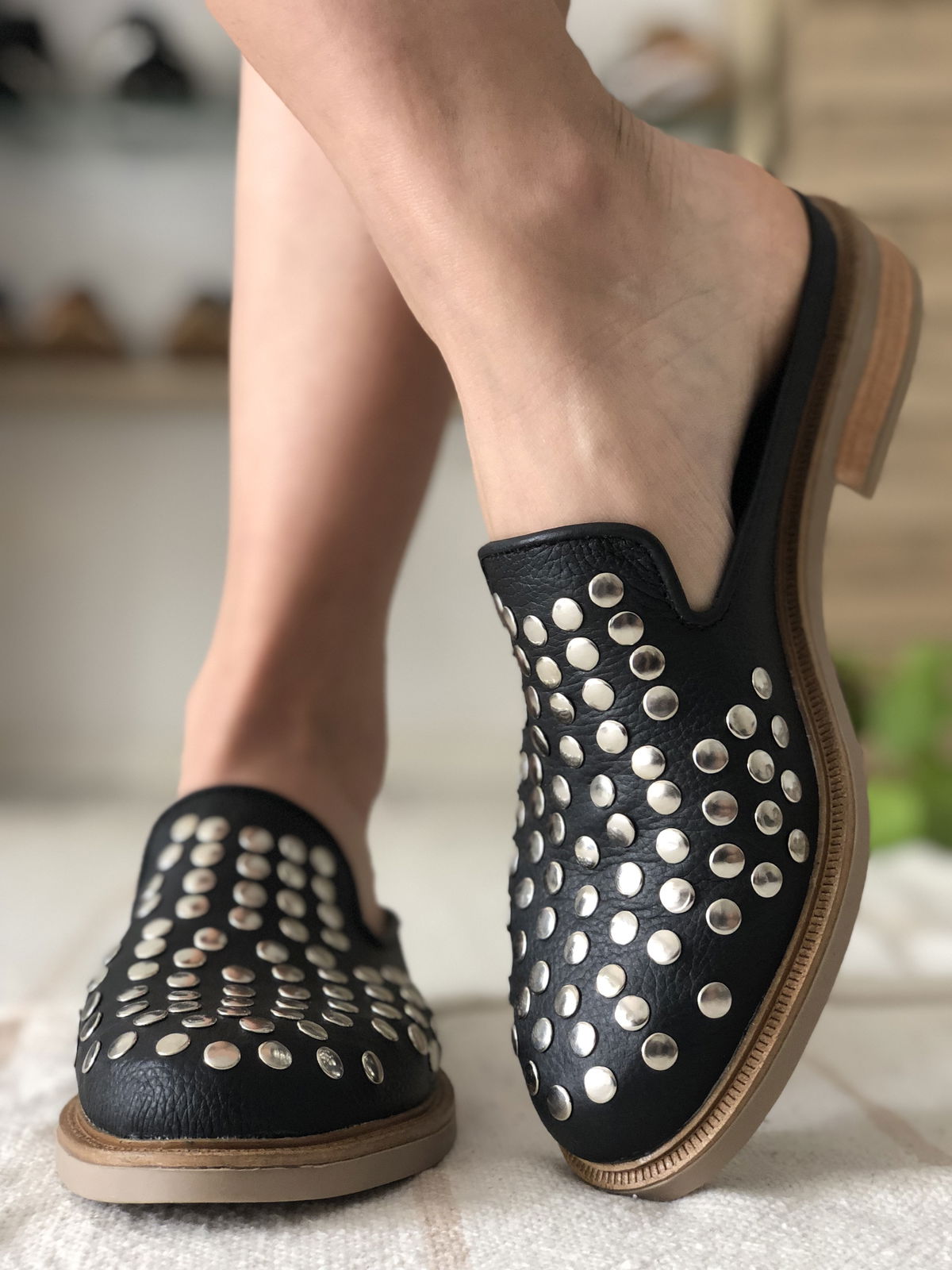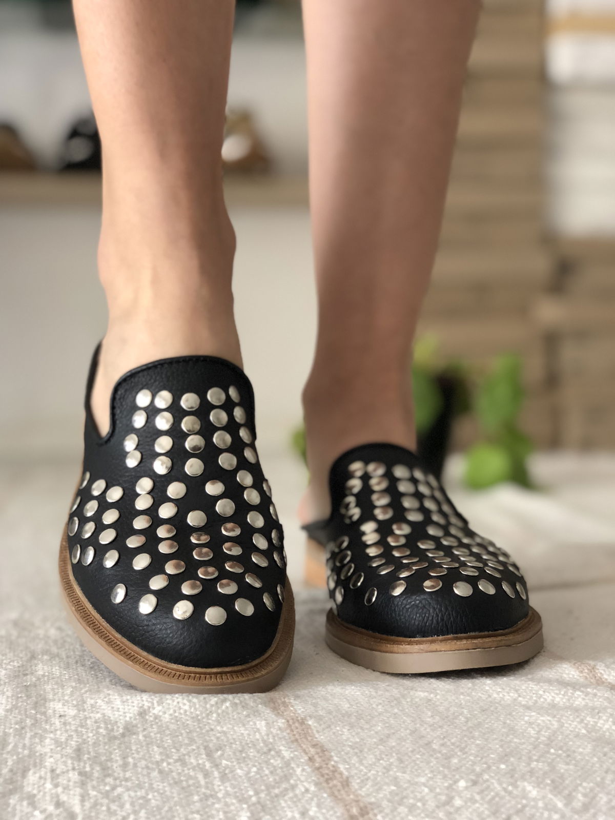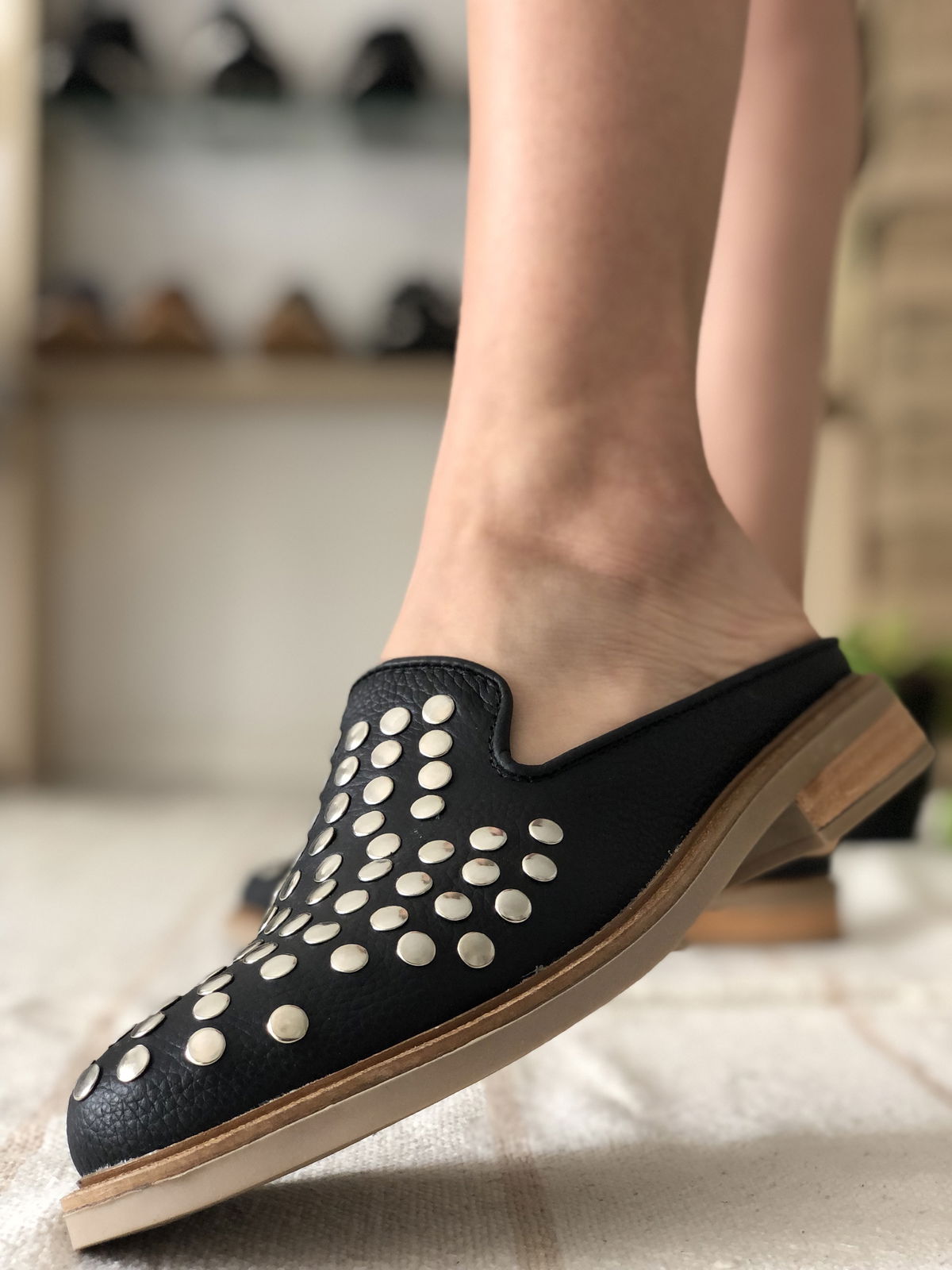 Zuecos de cuero vacuno con tachas de acero, remachadas.
